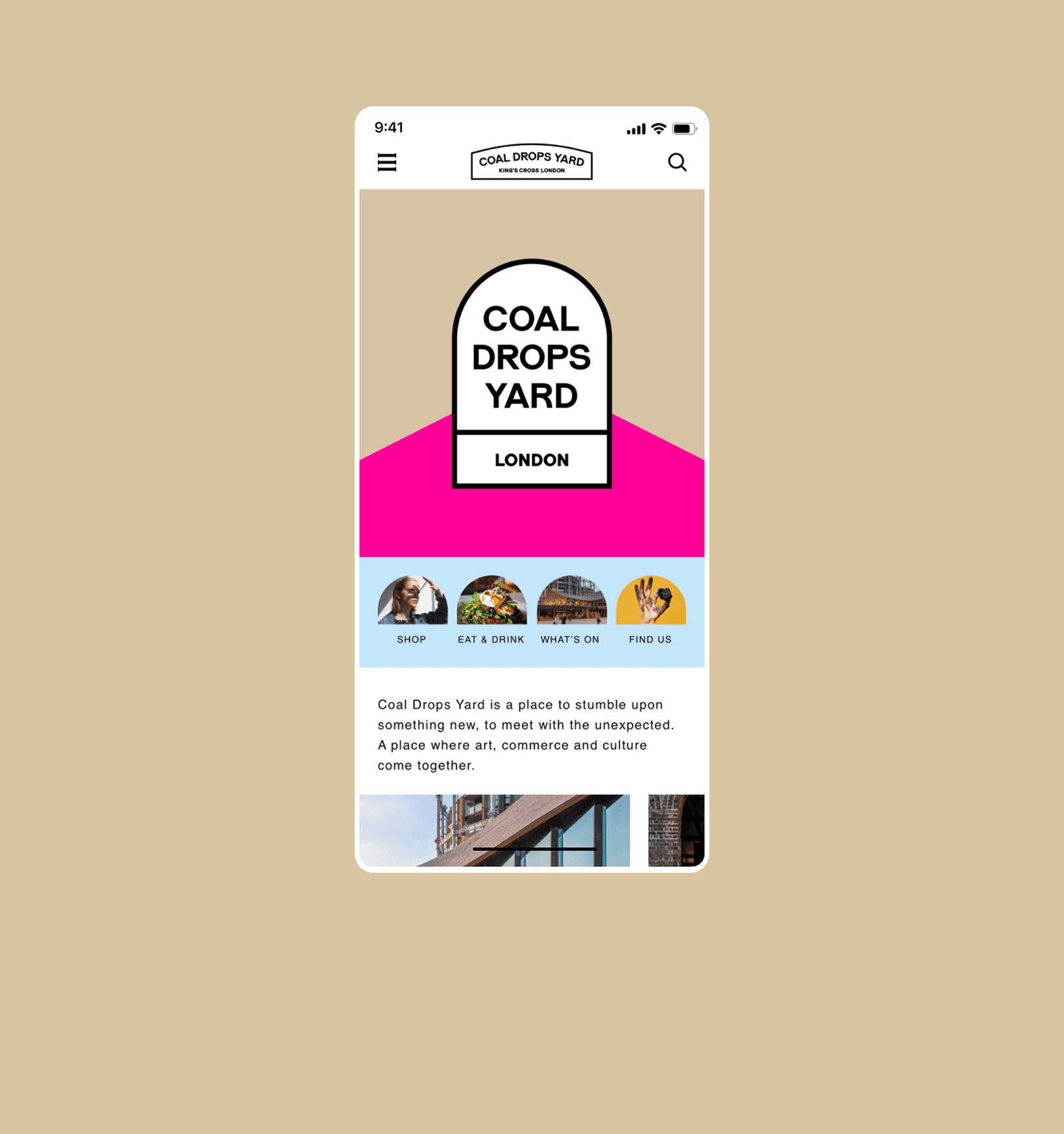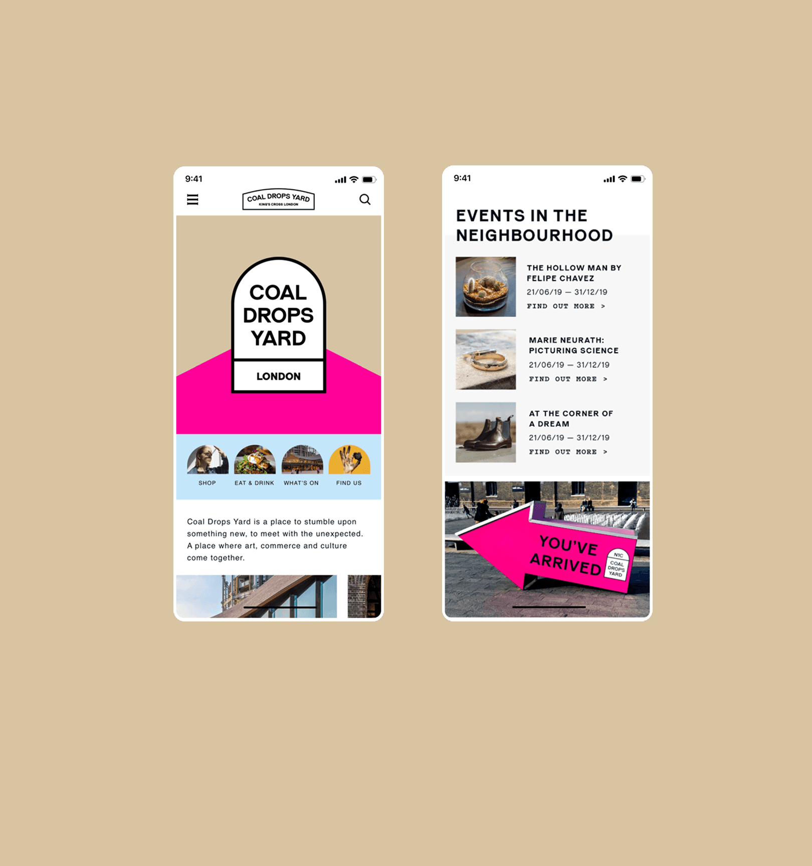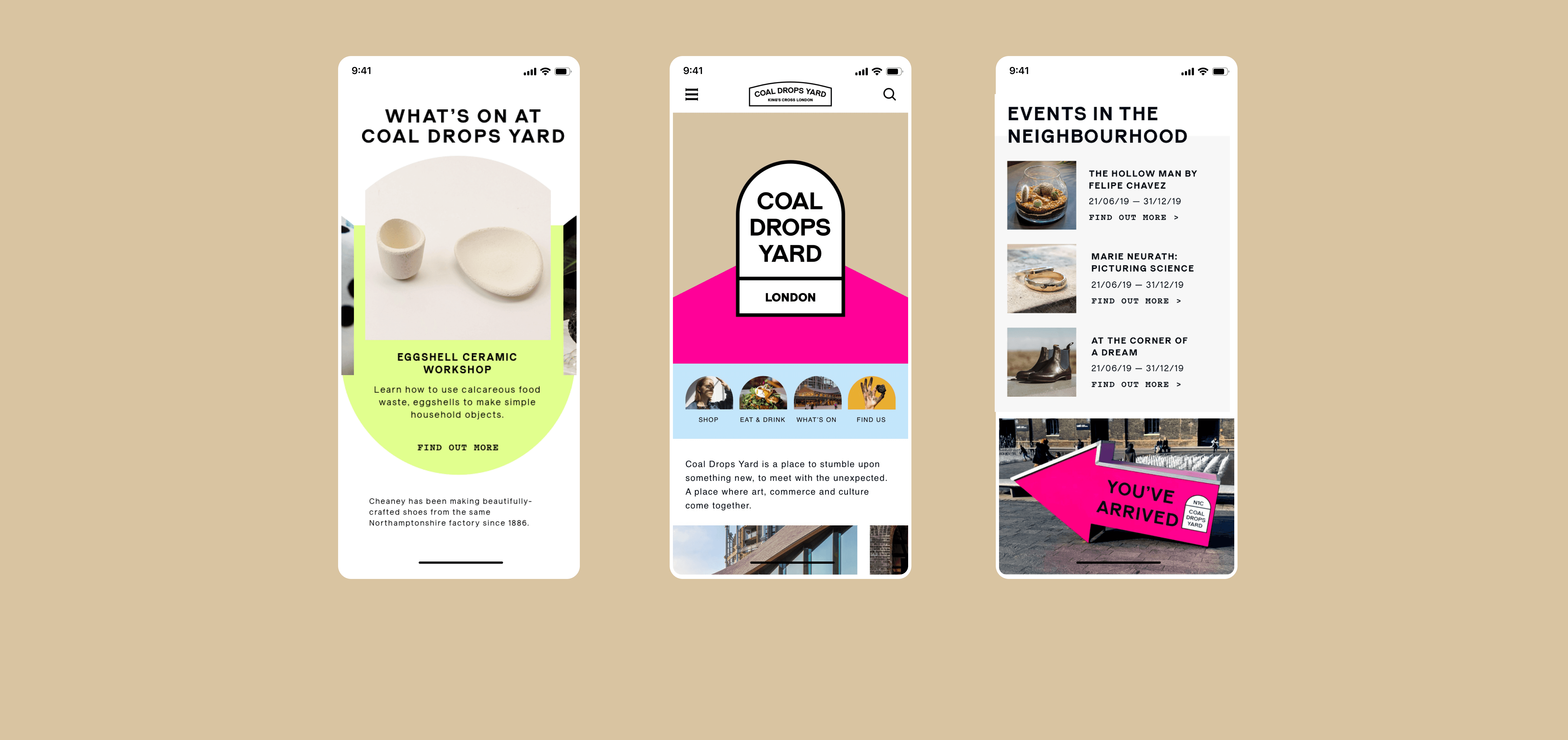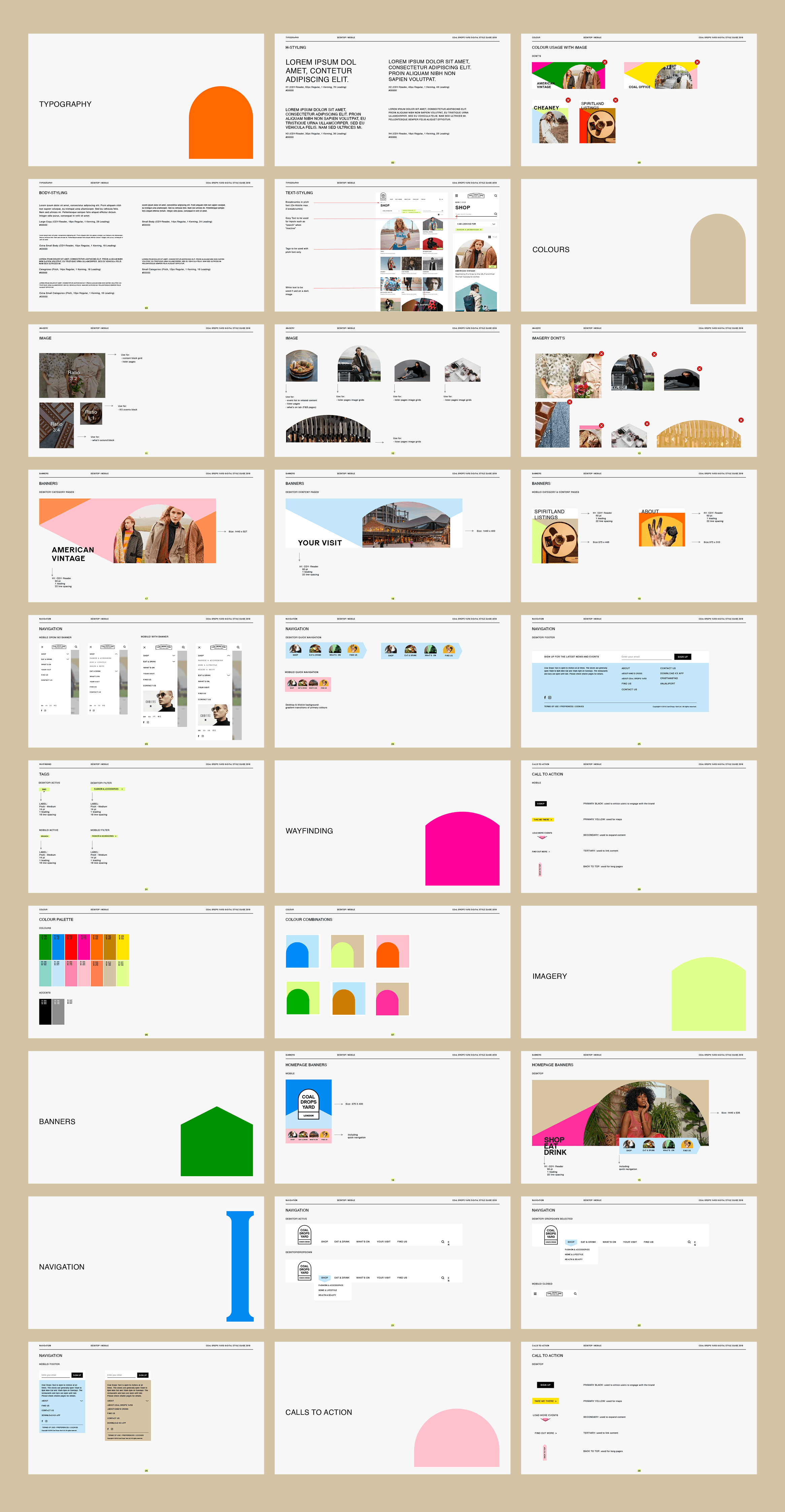 The new website makes use of the brand's strong colors, shapes, and typography to create a visual structure and enhance the simplified layout. It carefully guides users into the Coal Drops Yard experience, helping them know the space, find stores, learn about brands, events, and facilities.