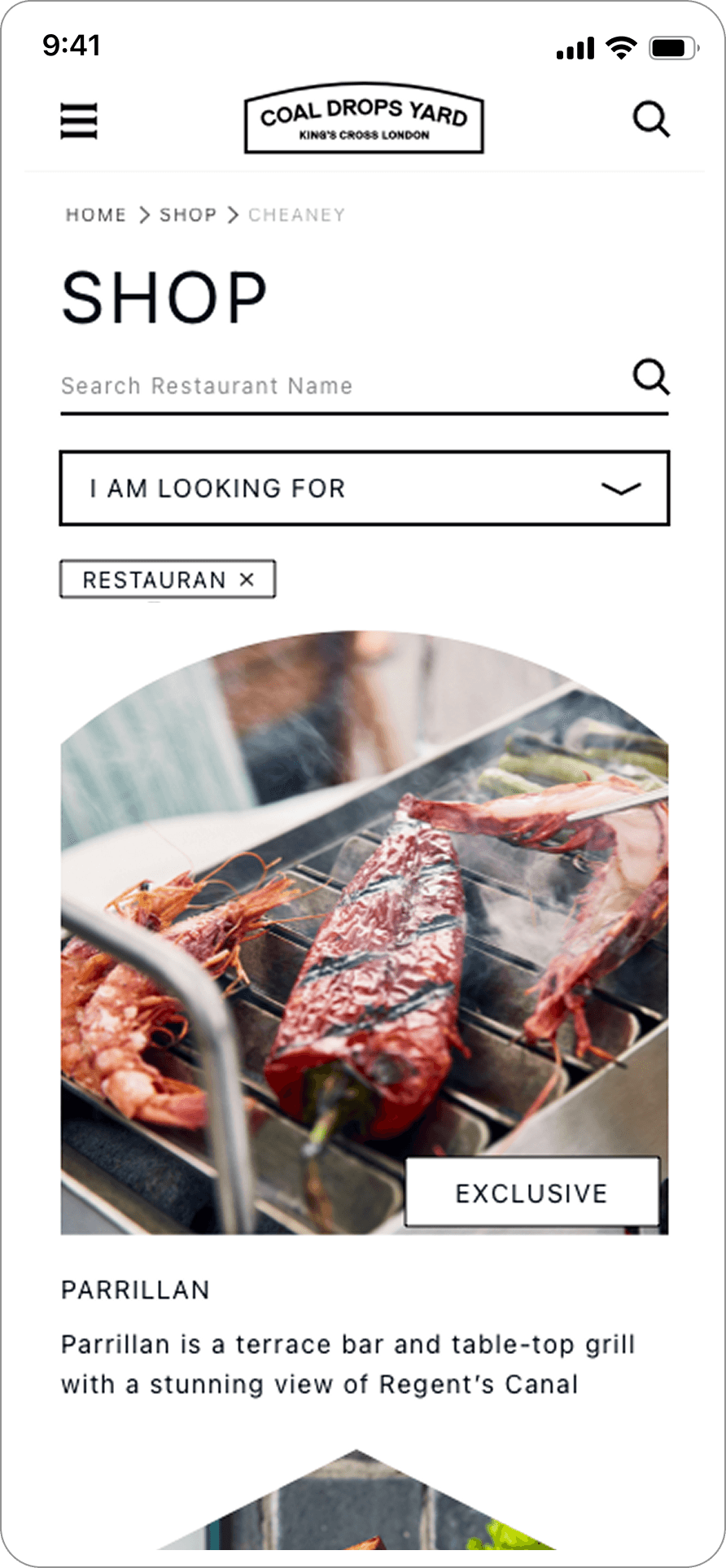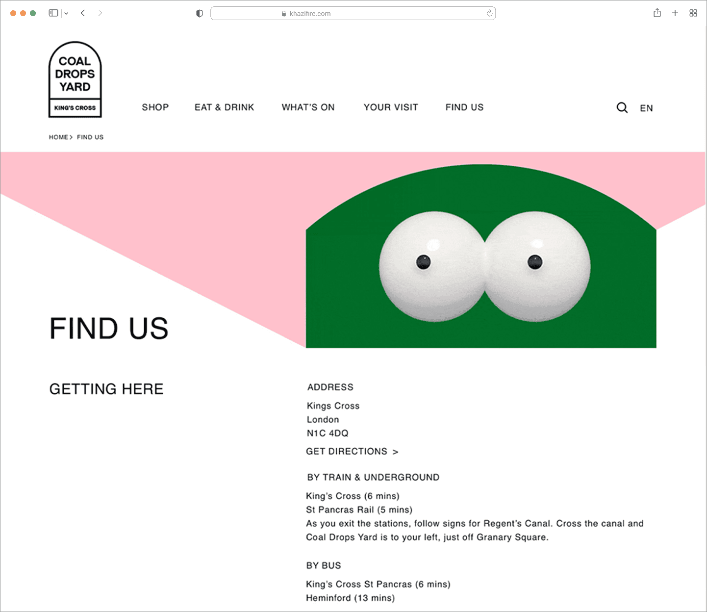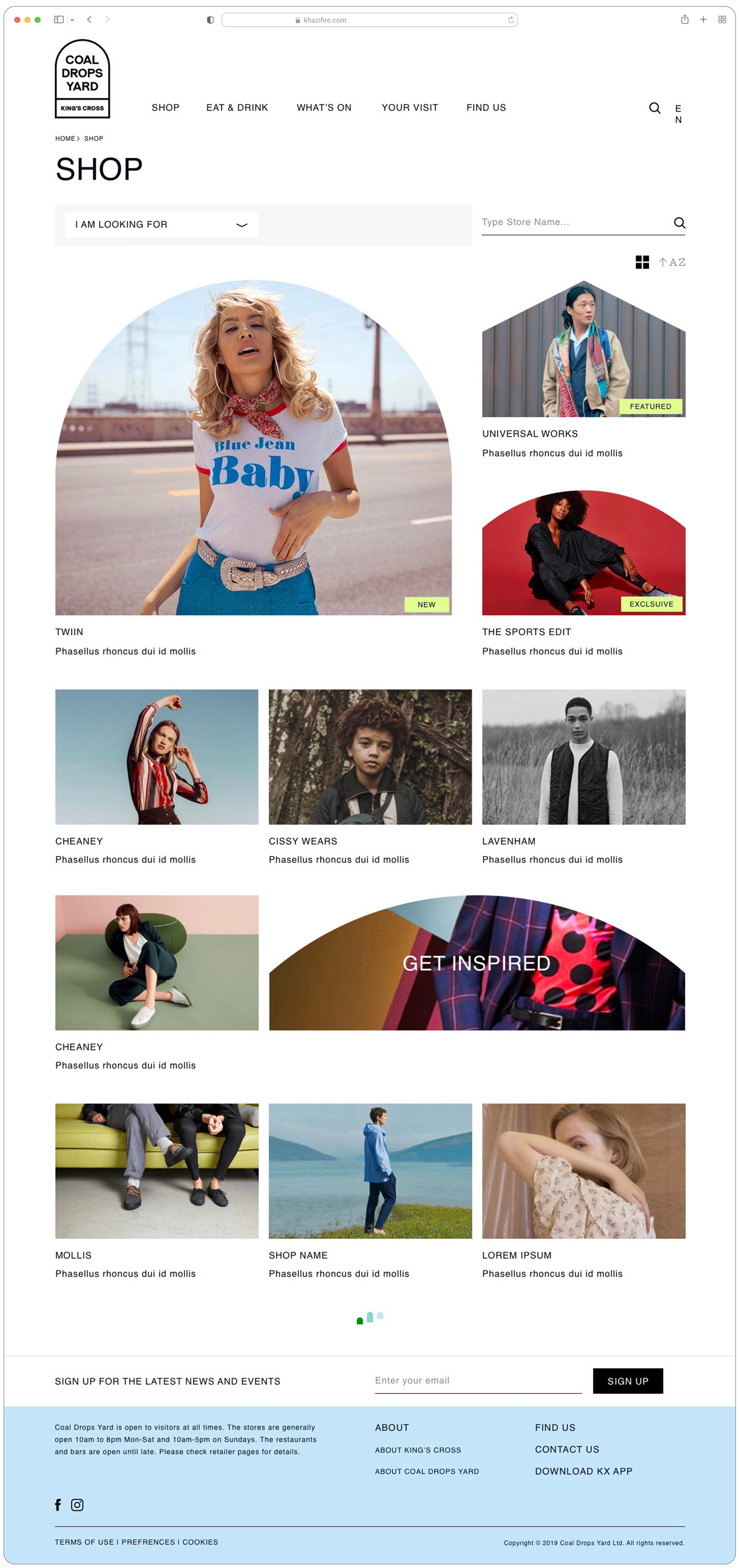 Redesign of the Coal Drops Yard website. Aiming at a clear yet unconventional interface, that helps customers find stores and events while sustaining brand uniqueness.